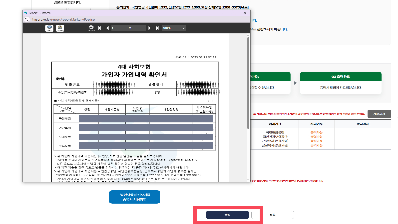 이렇게 하면 '4대 사회보험 가입내역확인서' 발급이 모두 완료됩니다. 참 쉽죠?