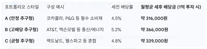 "이론은 알겠는데, 실제로 어떻게 투자하죠?" 여러분을 위해 배당 귀족주로 1억원을 투자했을 때, 월평균 얼마의 '세후 월세'를 받을 수 있는지 3가지 스타일로 시뮬레이션해 봤습니다.
