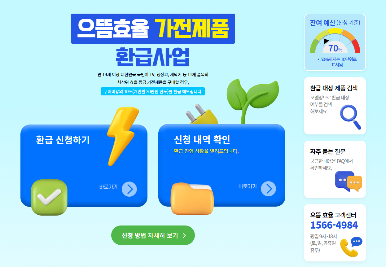 • 환급 대상: 만 19세 이상 대한민국 국민이라면 누구나! (복지 할인 가구나 다자녀 가구 등 특정 계층을 대상으로 하는 '한전 고효율 가전' 사업과 다르니 헷갈리지 마세요!)